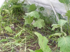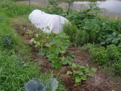 The newly mulched cucumbers and the eggplant tent behind them
