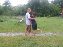Dad and Madi fording the stream in the yard