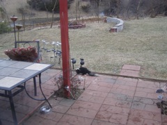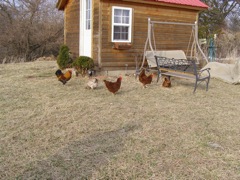 All the chickens come visiting on the patio, including the one-legged Petunia!